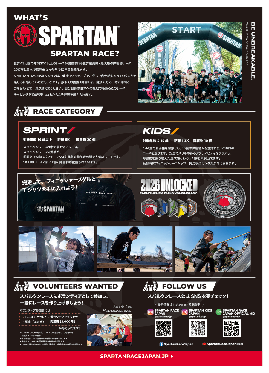 「SPARTAN RACE」(スパルタンレース)とは、世界42カ国で年間200以上のレースが開催される世界最高峰・最大級の障害物レースです。