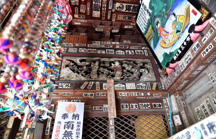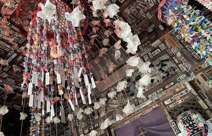・堂内の装飾と千疋猿(安産や子ども成長を願って奉納された人形)