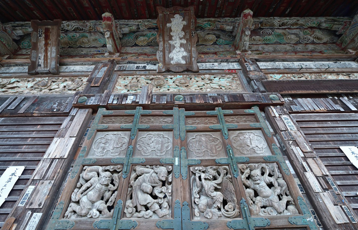 ・観音堂の正面扉の彫刻:風神・雷神・迦陵頻伽(かりょうびんか)の浮彫が施されています。