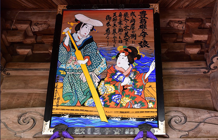 その時、傘を被った女性が舟に乗って現れ、娘を救い、悪魚を退治したといいます。